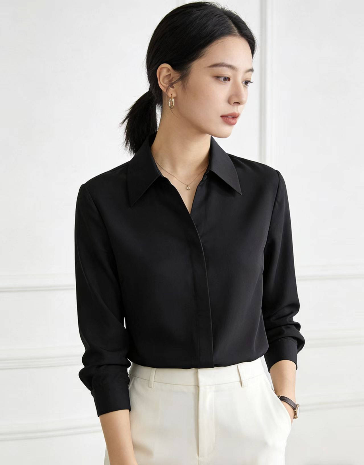 <p>This black women's shirt is simple yet sophisticated, with a classic solid color design that is versatile and not picky. A sleek lapel paired with a slim and slightly loose fit enhances the body shape, making it look slimmer and more elegant. It is suitable for daily commuting. Selected soft and skin friendly fabrics, with good drape, breathable and comfortable, not easy to wrinkle and easy to maintain. The basic style is simple and elegant, capable and exquisite when worn alone, with a layered feel when layered inside, making it easy to create an intellectual and elegant urban women's outfit.</p>